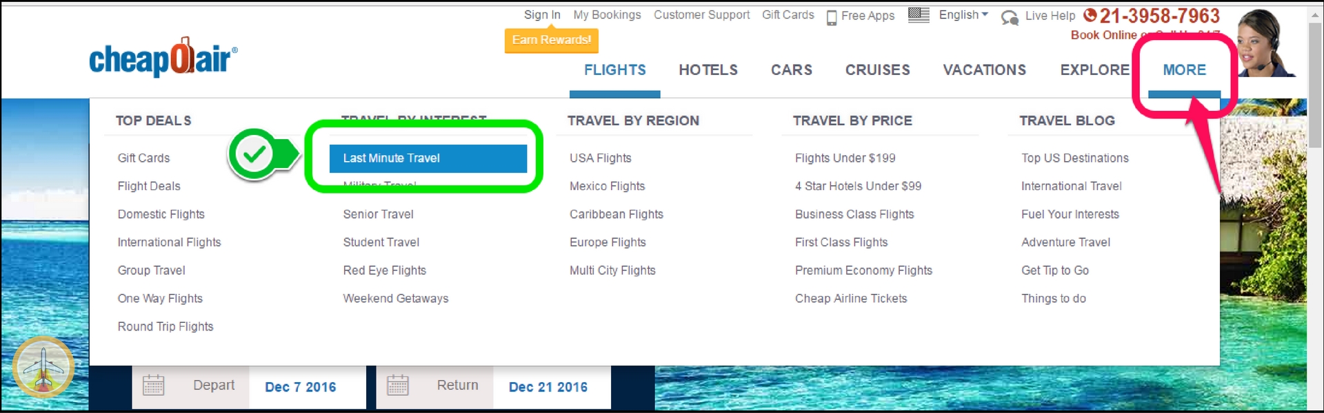 Para encontrar as promoções de última hora, clique em “more” e depois em “Last Minute Travel”, veja: