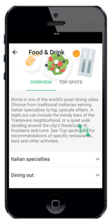 Por exemplo: para Roma o Google Trips explica um pouco da origem da culinária e separa as sugestões de locais por tipo de cozinha, pizzaria, bar, tradicional e etc (aba “Overview”). Além de oferecer uma outra aba com os mais visitados (aba “Top Spots”).