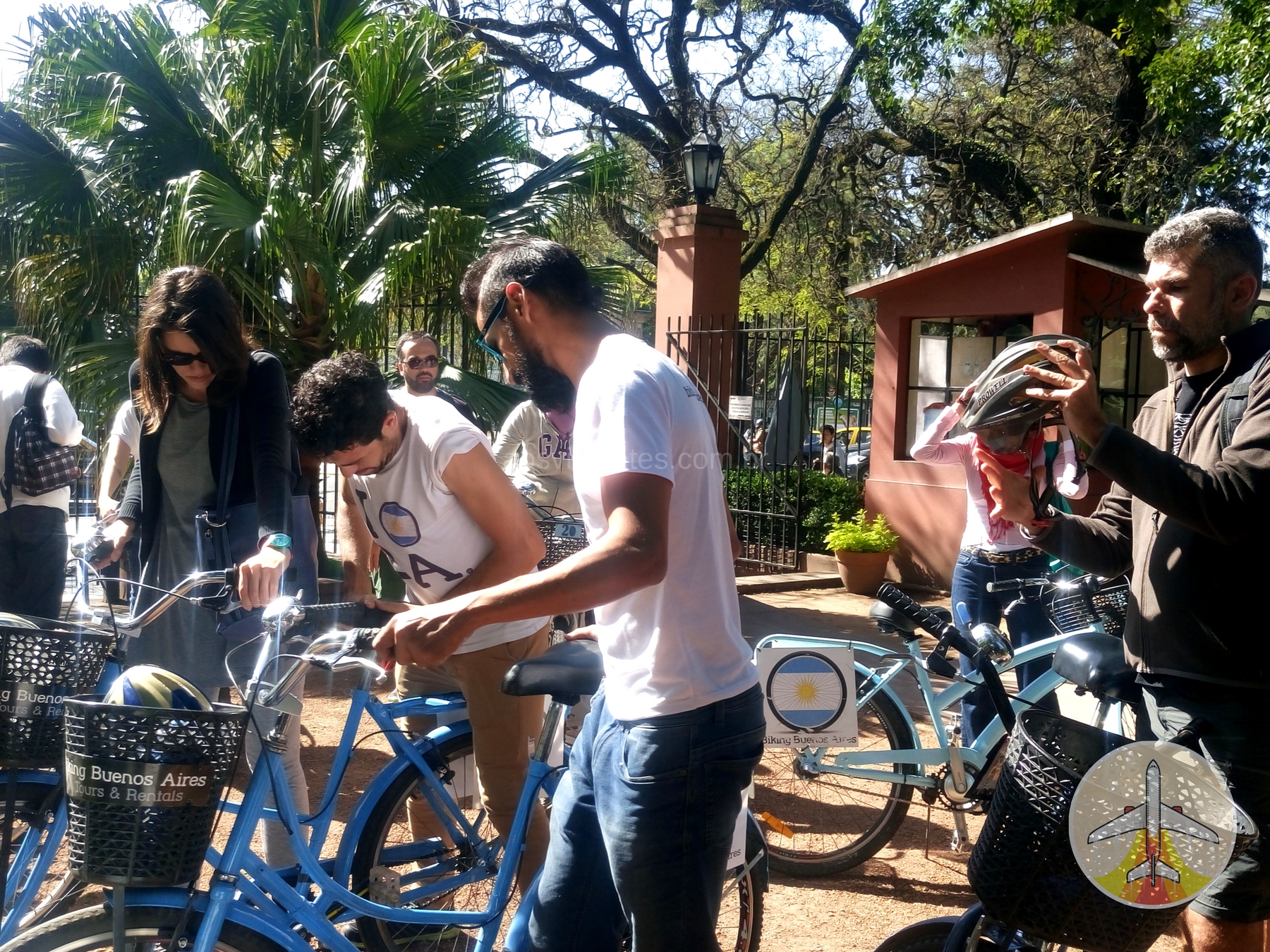 Os guias que nos acompanharam foram o Santiago e o Pepe. Há uma explicação inicial sobre o trajeto e ajustes na altura das bikes. Eles também oferecem protetor solar, água e toda a assistência com as bikes durante o percurso.