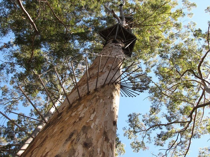 As árvores “Karri” da Austrália crescem até 90 m de altura. Oito dessas árvores foram escolhidas como pontos de vigia, plataformas foram construídas nos seus topos e meios de escala-las também. Hoje, como parte de turismo da região, 3 dessas árvores foram designadas como “como árvores de escalada” e os turistas podem ter essa emoção. Imagine estar a 61 m de altura, na árvore Gloucester, ou a 71 m, na árvore bicentenária Dave Evans? Essa é a  mais alta das tres (na foto). Venha preparado para altura e com bons sapatos anti-derrapantes.