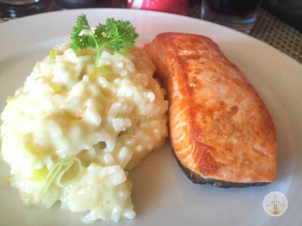 Pedi um salmão com risotto de alho poró e estava muito bom! O restaurante para almoço funciona na mesma área onde é servido o café da manhã.
