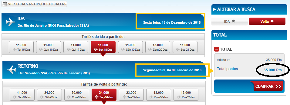 Comprando passagem Rio – Salvador no site da TAM por milhas: 35000 milhas.