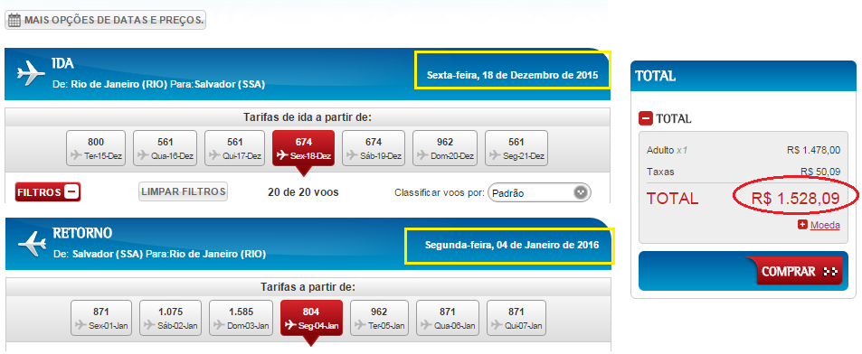 Pra se ter uma ideia, simulei no site uma compra de passagem Rio de Janeiro – Salvador saindo na sexta dia 18/12 e voltando na segunda dia 04/01, ou seja, pós Natal e Ano Novo e um dos trechos mais caros para a época.
