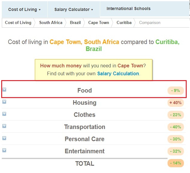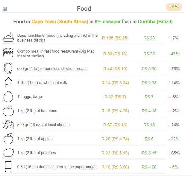 Por exemplo, comida, “Food” é 9% mais barata na Cidade do Cabo (Cape Town) do que em Curitiba: