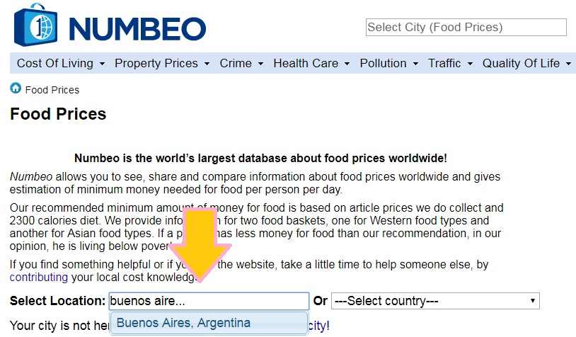 Primeiro, acesse o site do Numbeo na parte de “Food Prices” e coloque a cidade que você irá.