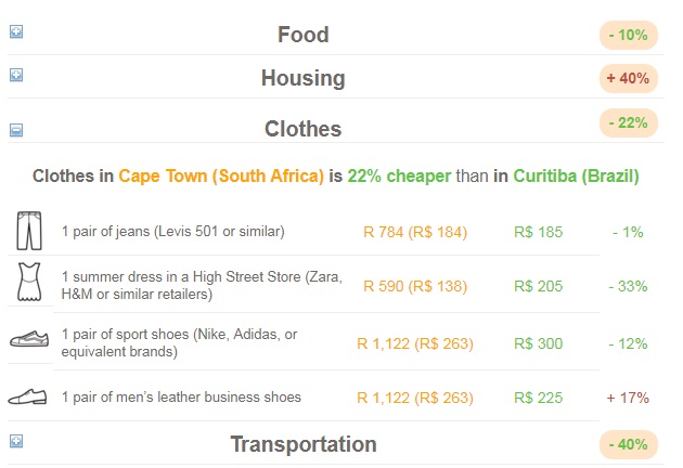 Por exemplo, comida, “Food” é 9% mais barata na Cidade do Cabo (Cape Town) do que em Curitiba:
