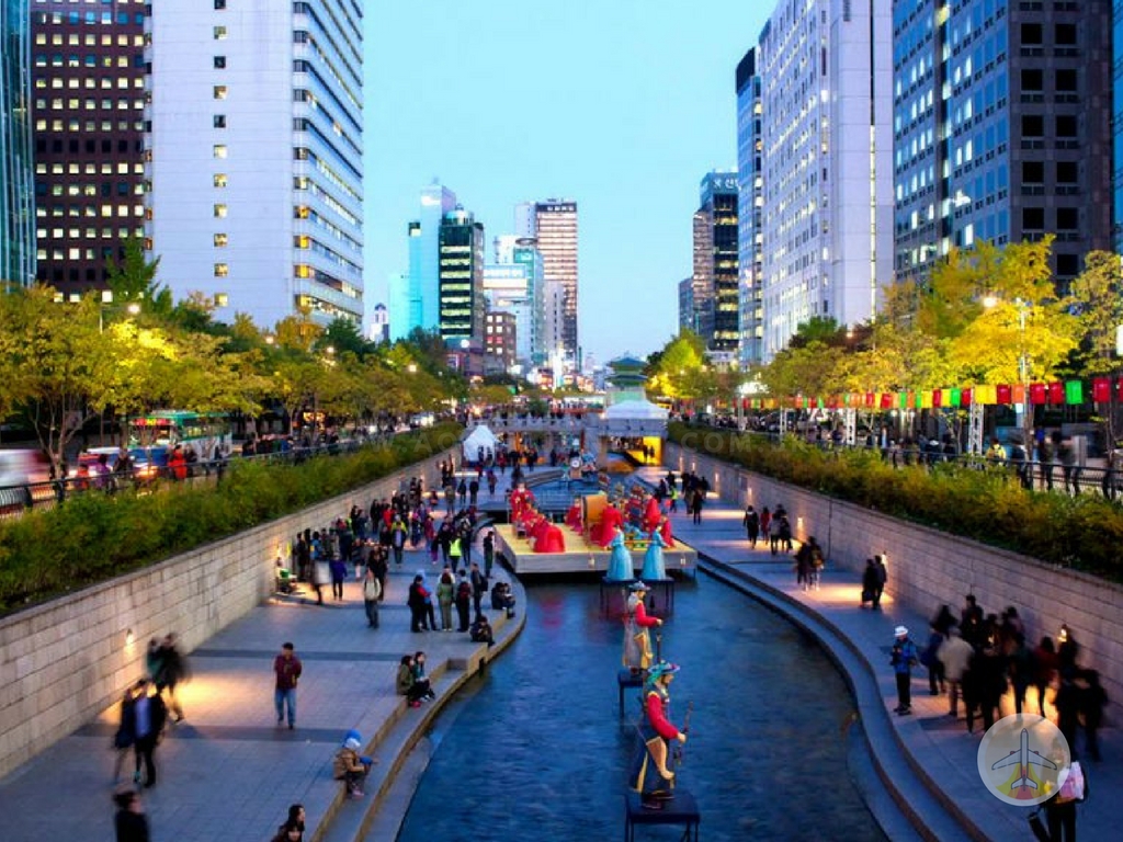Outro lugar que você precisa ir é fazer a caminhada margeando o Rio no local conhecido como Cheonggyecheon.