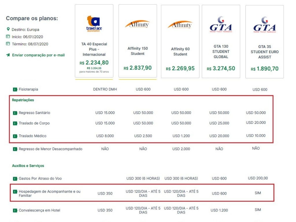 Para comparar cada item de seguro, fiz avaliação de 5 seguros viagem na seguros promo.